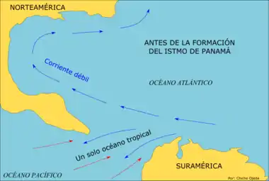Hay evidencias de actividad en el istmo desde hace 20 millones de años, este proceso consistió en la llegada de un arco volcánico (Panamá), al borde noroccidental de Suramérica. Primero hubo un cierre temprano por movimiento de las placas tectónicas, probablemente entre hace 20 y 15 millones de años, puesto que hay evidencia de fauna norteamericanas en el canal de Panamá.[5] Luego, una vez el puente estuvo establecido, se rompe nuevamente y solo se cierra cuando el volcán del valle crece lo suficiente para llenar el canal interoceánico somero que se había establecido. El cierre total de los canales acuáticos poco profundos entre las aguas del Pacífico y el Atlántico se dio hace 3.5 millones de años.[6]