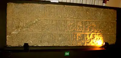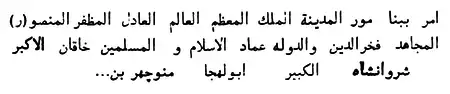 "La inscripción árabe (cúfica) en piedra del siglo XII de la Fortaleza de Bakú: "La construcción de la fortaleza fue ordenado por magnífico melik, científico, justo, triunfante, prosaico, mujahid (luchador) y mayor Khagan, Shirvanshah Abulhija Manouchehr bin". Fue encontrado en el año 1954. Museo de Historia de Azerbaiyán..." .[3] |