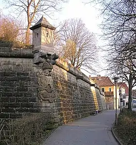 A mitades del siglo XVII, las nuevas fortificaciones, que recibían nombres de santos venerados en esta región, seguían en parte el estilo de la traza italiana.[7] En 1655, se construyeron las defensas de Santa Cunegunda al este, seguidas un año después por las de San Felipe. Las defensas de San Valentino (un bastión de 1657 en el zwinger de la muralla) y las de San Enrique (conocidas como Dreikirchen) se conservan hasta la actualidad, algunas relativamente intactas (o restauradas) y otras en estado de ruinas. En 1675, se incorporaron las defensas de San Pedro (el baluarte Dernbach) en el noreste, y en 1683 las de San Martín, siendo las más grandes y destacadas de todas (conocidas como Neuwerk, ‘Obra nueva’).[2] Estas fortificaciones ya no existen a día de hoy.[9]