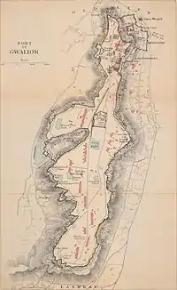 La fortaleza de Gwalior es una fortificación cerca de Gwalior, Madhya Pradesh, India. Con murallas de 11 metros, ocupa una área de 3 km²[1] sobre un peñón de arenisca y basalto de 2.4 km de largo[1] y una anchura media de unos 275 m[2] en la cordillera de Vindhya, en el centro geográfico del país.