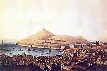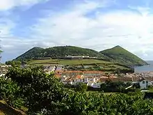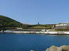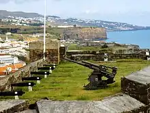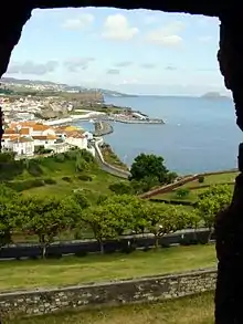 - Monte Brasil visto desde la bahía de Fanal; en segundo plano, a la izquierda, un trozo de las murallas de la fortaleza.