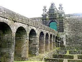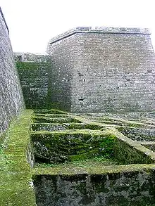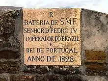 - baluarte de São Pedro, a la izquierda de la Puerta de Armas, con quince troneras. En su ángulo izquierdo existe un pañol de batería. Se continuaba con una extensa cortina donde en 1766 se abrieron otras seis troneras a la izquierda y siete a la derecha, que no han llegado a nuestros días. El muro, a la derecha de la Puerta de Armas,[2] enlaza con el