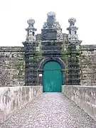 - Esta Puerta tallada en piedra volcánica de inspiración manierista, estaba coronada por las armas reales hispanas, siendo sustituidas posteriormente por las portuguesas.