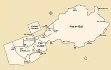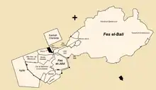 Fes el-Jdid tenía su propio conjunto de murallas y puertas fortificadas. Su entrada norte, al comienzo del camino a Meknes, consistía en un puente fortificado (ahora el Viejo Mecúar ) sobre el Oued Fes. Este puente se estableció entre dos puertas: Bab es-Sebaa (la actual Bab Dekkakin ) y Bab el-Qantara (o Bab el-Oued ; ahora reemplazada por la puerta de Dar al-Makhzen). [12] La puerta sur de la ciudad, Bab 'Oyun Sanhaja (más tarde Bab Semmarine ), y la puerta occidental, Bab Agdal, compartían un diseño defensivo similar con Bab es-Sebaa al tener una entrada inclinada y torres laterales.[12] En el interior, la ciudad se subdividió en diferentes distritos, algunos de los cuales, incluido Dar al-Makhzen, tenían muros y puertas que los separaban de los demás.[2] Otro distrito, inicialmente conocido como Hims y luego convertido en el Mellah judío, también se agregó al sur de Bab Semmarine, entre las murallas internas y externas de la ciudad de este lado. [1] [2]