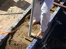 Las paredes se construyeron de abajo hacia arriba un nivel a la vez. Los trabajadores prensaron y empaquetaron los materiales en secciones que van desde 50 y 70 cm de largo que se mantuvieron unidas temporalmente por tablas de madera. Una vez que el material se asentaba, se podían retirar las sujeciones de madera y se repetía el proceso sobre el nivel previamente completado.[5] Este proceso de andamiaje inicial de madera suele dejar huellas en forma de múltiples hileras de pequeños agujeros visibles en la cara de los muros.[9] En muchos casos, los muros se cubrían con una capa de cal, estuco u otro material para darles una superficie lisa y proteger mejor la estructura principal.[7]