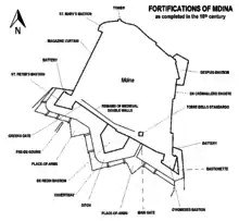 La configuración actual de las fortificaciones de Mdina consiste en un perímetro irregular de muros cortina reforzados por varios bastiones. Las murallas del norte, oeste y este están construidas en el perímetro de la meseta natural, por lo que eran difíciles de atacar. El perímetro sur de la ciudad está construido sobre terreno llano, a lo largo de lo que hoy es la frontera con Rabat. Era la única dirección realista para atacar la ciudad, y por eso se la conocía como el Frente de Tierra de Mdina. El perímetro sur contiene un bastión en forma de punta de flecha con orillones rectangulares en cada extremo, con un gran bastión pentagonal en el centro: