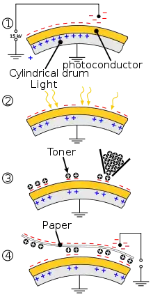 En este ejemplo, el tambor de fotocopiadora y el papel están cargados negativamente y el tóner está cargado positivamente. Por el contrario, algunas fotocopiadoras tienen un tambor y papel de fotocopiado con carga positiva y un tóner con carga negativa.