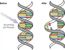 Los rayos UVB son un mutágeno primario que solo puede penetrar a través de la capa epidérmica (más externa) de la piel, lo que produce mutaciones en el ADN. Estas mutaciones surgen debido a cambios químicos, la formación de dímeros de pirimidina de ciclobutano y fotoproductos formados entre bases de pirimidina adyacentes. Estas mutaciones pueden estar clínicamente relacionadas con signos específicos de fotoenvejecimiento, como arrugas, aumento de la elastina y daños en el colágeno.[5][6]