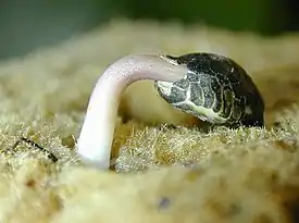 Una plántula que emerge en la oscuridad sigue un programa de desarrollo conocido como skotomorfogénesis (desarrollo oscuro), que se caracteriza por la etiolación. Tras la exposición a la luz, la plántula cambia rápidamente a la fotomorfogénesis (desarrollo de la luz).[5]