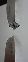 La imagen de un cigüeñal roto muestra que la pieza falló debido a un defecto en la superficie cercana al bulbo (abajo en el centro de la imagen). Las marcas semicirculares cerca del origen indican una grieta que crece en el material mediante un proceso conocido como fatiga. El cigüeñal también muestra "achurado", que son las líneas en las superficies de fractura que se remontan al origen de la fractura. Algunos modos de crecimiento de grietas pueden dejar marcas características en la superficie que identifican su modo de crecimiento y origen en una escala macro, como por ejemplo el estriado formado por la fatiga del amterial.