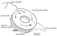 En el caso del catéter de implante mamario fallido, la trayectoria de la fisura fue muy simple, pero la causa es más sutil. Además, el microscopio electrónico de barrido mostró numerosas microfisuras entre la bolsa y el catéter, lo que indica que la unión adhesiva entre los dos componentes había fallado prematuramente, quizás debido a una fabricación defectuosa. El material de construcción de la bolsa y del catéter, la goma de silicona, es un elastómero físicamente débil y el diseño del producto debe tener en cuenta el desgarro bajo esfuerzo cortante del material.