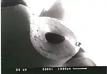 ![]() Catéter de implante mamario fracturado (imagen MEB) |