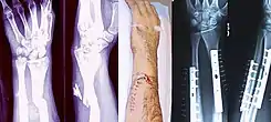 ![]() Vista interna y externa de un brazo con una fractura compuesta, antes y después de cirugía. | ||