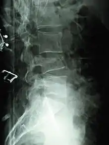 Una fractura por compresión[1][2] es el colapso de una vértebra. Puede deberse a un traumatismo o al debilitamiento de la vértebra (comparar con una fractura por estallido). Este debilitamiento se observa en pacientes con osteoporosis u osteogénesis imperfecta, lesiones líticas de tumores primarios o metastásicos, o infección. En pacientes sanos, se observa con mayor frecuencia en personas que sufren choques verticales extremos, como la expulsión de un asiento de eyección. En las vistas laterales de las radiografías simples, las fracturas por compresión de la columna aparecen característicamente como deformidades en cuña, con mayor pérdida de altura en la parte anterior y posterior y pedículos intactos en la vista anteroposterior.