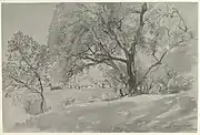 Français estuvo a menudo en compañía de otros artistas durante estas visitas y con Corot, Courbet, Jongkind y el local Boudin, formó parte de la école de Honfleur ( escuela de Honfleur ) que se sintieron atraídos por pintar la luz y los paisajes alrededor de Honfleur en Normandía. Las pinturas creadas durante este interludio, por Français y sus compañeros artistas, más tarde inspiraron a Jongkind y Claude Monet para abrir la Escuela Impresionista de San Simeón en Honfleur en 1862. [16] Les Hêtres de la côte de Grâce près de Honfleur (1859) es un buen ejemplo de sus obras en Normandía en la década de 1850. Presenta un árbol desgastado distorsionado por los vientos costeros que azotan la costa. Como siempre con Français, hay precisión en los detalles. Gran parte de la pintura presenta un cielo imponente que muestra el conocimiento de las obras de John Constable por parte de Français. [17]