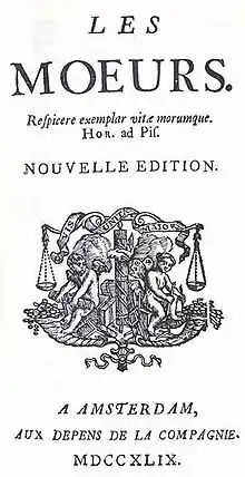 - Les Mœurs, s.l., s.e., 1748.(Las costumbres) Tercera edición / 1748 [1] [2]