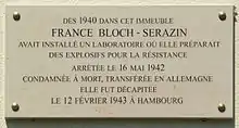 En la pared del edificio de París de Plaza del Danubio, en el distrito 19, donde Bloch-Sérazin había transformado su apartamento en un laboratorio para la preparación de explosivos, se colocó una placa conmemorativa el 4 de diciembre de 2008.[15]