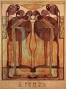 Utilizó preferentemente la acuarela, con un acabado parecido al esmalte, y trabajó a menudo con incrustaciones en madera, gessos, cloisonnés y repujados en oro y plata. También diseñó muebles, mosaicos, vidrieras y bordados.[6]