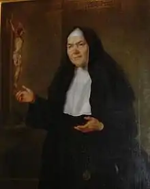 Atributos | Con hábito de monja junto a un crucifijo | ||