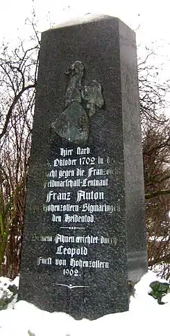 ![]() Placa memorial en el cementerio en Weil am Rhein: Aquí el Teniente-Mariscal de Campo Francisco Antonio de Hohenzollern-Sigmaringen murió heroicamente el 14 de octubre de 1702 en la batalla contra los franceses; construido por el Príncipe Leopoldo de Hohenzollern — 1902 | ||