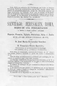 En 1875 pide un año de licencia para hacer un viaje de peregrinación con motivo del año del jubileo universal. Junto con José María Fernández Sánchez, también catedrático de la Universidad de Santiago, viajaron por España, Francia, Egipto, Palestina, Siria e Italia. Al finalizar, escribieron y publicaron en 1880, por fascículos semanales, los tres tomos del libro: “Santiago, Jerusalén, Roma, Diario de una Peregrinación”, monumental obra de casi 2.000 páginas describiendo las peripecias y los lugares del viaje.
