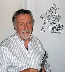 ![]() Retrato del artista con uno de sus dibujos en el 4º aniversario de la sala de exposiciones Magenta (26-04-2008). | ||