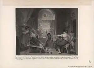 Para la Compañía para el grabado de los cuadros de los Reales Palacios grabó en 1796 Las hilanderas de Velázquez, según dibujo de Agustín Esteve, trabajo por el que se le pagaron 30.000 reales, el Bufón con libros del mismo Velázquez por dibujo de León Bueno, por el que cobró 5.000 reales en 1792, la Aparición de la Virgen a san Bernardo de Murillo a partir de un dibujo de León Bueno, aguafuerte por el que cobró 25.000 reales, y el Magistrado con un crucifijo de Leandro Bassano por dibujo igualmente de León Bueno, erróneamente interpretado como retrato de Tomás Moro y atribuido a Tiziano, por el que se le pagaron 1.000 reales. Además, y para esta misma serie, dirigió a su discípulo Manuel Esquivel en las reproducciones de Esopo y Menipo de Velázquez.[7]