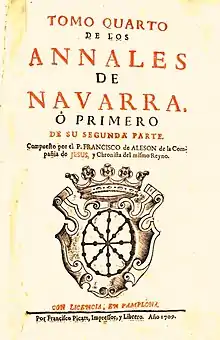 ![]() Tomo IV de los Anales del Reino de Navarra, el primero escrito íntegramente por Alesón | ||