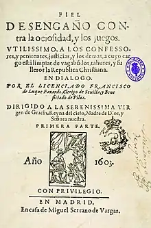 - Fiel desengaño contra la ociosidad y los juegos. Utilissimo a los confessores y penitentes, justicias, y los demás, a cuyo cargo está limpiar de vagabundos, tahúres, y fulleros la República Christiana. En Diálogo. Por el licenciado Francisco de Luque Faxardo, Clérigo de Sevilla y Beneficiado de Pilas, Madrid, en casa de Miguel Serrano de Vargas, 1603