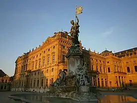 En la fuente de cuatro salidas (Vierröhrenbrunnen) de Wurzburgo se levanta otra estatua de Franconia esculpida por Balthasar Neumann junto con Jacob von der Auvera y Johann Peter Wagner que se estrenaría echando agua por primera vez el 23 de agosto de 1733 y terminada finalmente en 1766[1] sobre el obelisco se alza Fraconia con la espada ducal y el estandarte de Wurzburgo. En cada esquina del obelisco aparecen las cuatro virtudes llamadas Fortitudo, Prudentia, Temperantia y Justitia.[2] El canal de agua que abastecía a la fuente era de agua dulce siendo la primera vez que se abastecía a la ciudad con una fuente de agua potable.