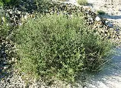 De ambiente terrestre. Especie de afinidad a suelos salinos y de yesos, en suelos de origen calizo, en zonas desérticas y semidesérticas, planicies o lomeríos.[1]