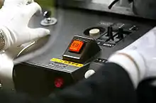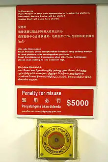 ![]() Un pulsador de emergencia en el Metro de Singapur, situado en un andén de la estación. La multa por su uso indebido es de 5000 dólares de Singapur |