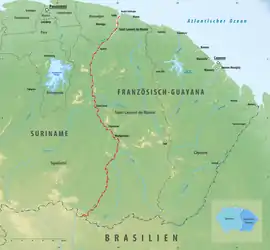 Trazado de la frontera franco-surinamesa (en rojo). | ||||