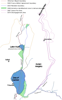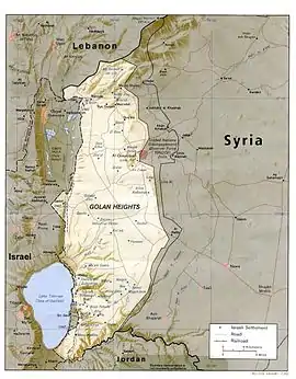 La frontera entre Siria e Israel fue establecida oficialmente en la década de 1920, y ha sido objeto de litigios entre los dos países. Al este de esta frontera internacional, los Altos del Golán fueron ocupados desde 1967 y anexados unilateralmente por Israel en 1981, pero Siria reclama que se trata de un territorio disputado entre los dos países y la anexión no es reconocida por las Naciones Unidas.[1]