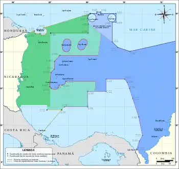 - Comenzando por el punto situado a 12°30′00″N 78°00′00″O, la delimitación de las áreas marinas y submarinas que pertenecen a cada una de las dos naciones consiste en una serie de líneas rectas, hasta el punto de coordenadas 11°00′00″N 81°15′00″O, donde comienzan los límites con Costa Rica.