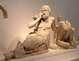 - Frontón este, zona derecha. Hipodamía levanta un faldón de su peplo como gesto ritual de la recién casada. Una joven arrodillada se ocupa de los caballos. Un adivino (Clitio, Yamo o Amitaón), muestra en su rostro la angustia al vaticinar el final de la carrera. La figura siguiente es un niño que juega con el dedo pulgar de su pie. Por último, la personificación del río Alfeo (o Kladeos) forma el ángulo del frontón.