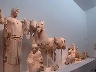 Las estatuas están esculpidas a escala 1,5 y son todas de bulto redondo, exceptuando tres de los caballos. Ninguna de las esculturas está completa, y tampoco se han encontrado restos de los carros (realizados en bronce como las armas de los personajes), salvo en el punto donde estaban unidos a los caballos. La ubicación de las figuras se ha decidido en función del lugar donde fueron encontradas durante las excavaciones, lo cual ha originado interpretaciones a veces divergentes y contradictorias.[1][2]