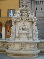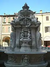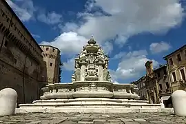 Cada fachada está decorada por un par de pilastras estriadas que sostienen un tímpano curvo, en cuyo interior se inserta un escudo heráldico. El escudo del lado septentrional es del papa Sixto V, el cual se superpone al rótulo del pueblo. Los otros dos escudos son del cardenal y legado papal Guido Ferreri, el vicedelegado papal Antonio Maria Galli y el cardenal y legado papal Domenico Pinelli. Cuatro hermas encuadernadas en volutas se encuentran colocadas en las esquinas de la fuente, coronadas por las figuras sentadas de tritones soplando trompetas de caracol, a través de las cuales se lanza el agua al fuente.