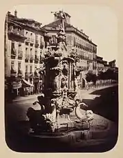 Alfonso Begué fotografió en 1864 la errante fuente de la Fama, instalada en 1732 en Antón Martín. Según Cayetano,[6] tras trasladarse en principio al barrio de Las Peñuelas,[7][lower-alpha 2][1] en 1880, fue desmontada y ‘guardada’. En 1911, recurriendo a materiales de otros monumentos se colocó en el parque del Oeste, hasta que en 1941 se trasladó a los jardines del Arquitecto Ribera, junto al Museo Municipal de Madrid.