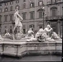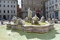La Fontana del Moro es una fuente localizada en el costado sur de la Piazza Navona en Roma, Italia. Representa a un moro, o africano, de pie en una concha marina con una cascada, luchando con un delfín, rodeado por cuatro tritones, situada en una base de mármol rosa.