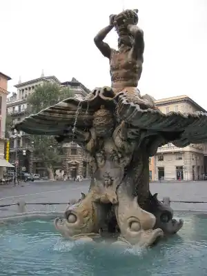 Queda a sólo unas manzanas de la obra de Borromini San Carlo alle Quattro Fontane. En la fuente, que Bernini ejecutó en travertino en 1642–43, el dios marino Tritón aparece lanzando un chorro de agua a través de una caracola, sentado sobre una enorme concha sostenida por cuatro delfines[1] que entrelazan la tiara papal con llaves cruzadas y las abejas heráldicas de los Barberini en sus colas escamosas. El Tritón, la primera de las fuentes de Bernini, se erigió para proporcionar agua del acueducto de Acqua Felice, que Urbano había restaurado, en una celebración dramática. Fue el último gran encargo de su gran mecenas.