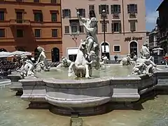 - Plaza Navona reúne un conjunto de fuentes monumentales: la principal es la Fuente de los Cuatro Ríos, construida en 1651 por Bernini en el centro de la plaza. La fuente sirve de base a un obelisco y representa los cuatro continentes conocidos en aquella época, a través de sus mayores ríos: el Danubio por Europa, el Nilo por África, el Ganges por Asia, y el Río de la Plata por América. En Lyon, hay una fuente muy similar. Como la plaza debía ser periódicamente inundada por ocasión de los juegos navales del Carnaval romano, en los dos extremos de la plaza fueron construidas otras dos fuentes: la Fuente de Neptuno, cuya pileta fue construida en 1576 siguiendo el diseño de Giacomo della Porta, y la Fuente del Moro .