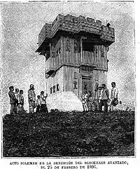 "...Comenzó la coremonia á las diez de la mañana con la bendición del blockhaus avanzado por el Rvdo. F. Suárez, luego bendijo el mismo las demás partes del fuerte; se izó el pabellón al son de la Marcha Real y dio el Coronel Gobernador vivas á la patria, á SS. MM. el Rey y la Reina y al Capitán general, todos los cuales fueron contestados con entusiasmo. A las doce bubho banquete, al que asistieron, invitados por el Coronel Gobernador los jefes y oficiales de la fuerza. Pronunciáronse entusiastas brindis, y en todos hubo recuerdos para el valeroso ejercito que en Cuba pelea por la integridad de la patria...."