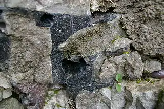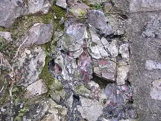 En ninguna de estas estructuras se ha encontrado cal ni cemento, todas ellas presentando la peculiaridad de estar más o menos consolidadas por la fusión de las rocas que las componen. Esta fusión, que ha sido provocada por la aplicación de un intenso calor, no es igualmente completa en los distintos fuertes, ni siquiera en los muros del mismo fuerte. En algunos casos, las piedras sólo se funden y se calcinan parcialmente; en otros, sus bordes contiguos se fusionan de modo que estén firmemente cementados entre sí; en muchos casos, los trozos de roca están envueltos en una capa vidriosa similar a un esmalte que los une en un todo uniforme; y en raras oportunidades, toda la longitud del muro presenta una masa sólida de sustancia vítrea.[2]