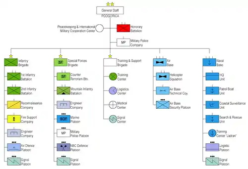 Las fuerzas militares actualmente mantienen una fuerza de 2.094 miembros activos. El grueso de su equipamiento y fuerzas fueron heredadas de las fuerzas armadas de la Unión Estatal de Serbia y Montenegro; ya que Montenegro contenía totalmente la línea de costa de la anterior unión, prácticamente retuvo enteramente la fuerza naval.