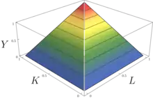 Donde q es la cantidad de producción, z1 y z2 son las cantidades utilizadas del input 1 e input 2 respectivamente, y a y b son constantes determinadas tecnológicamente.