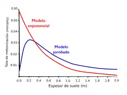La reducción de la tasa de meteorización con el espesor del suelo a su vez está relacionada exponencialmente con la amplitud de temperatura con profundidad creciente bajo la superficie de tierra, y también la disminución exponencial en penetración de agua freática (para suelos que puedan drenarse). Los parámetros P0 y k está relacionados con clima y tipo de materiales de origen. Heimsath Et al. (1997) encontró que el valor de P0 estaría entre 0.08 a 2.0 mm/año para lugares como el Norte de California, y 0.05–0.14 mm/año para sitios como el sureste de Australia. Por otra parte los valores de k no varía significativamente, oscilando entre 2 a 4 m−1.[2]