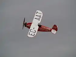 En una Eagle similar Juan Ignacio Pombo voló en 1935 hasta México, hazaña que hizo un hueco a esta avioneta en la historia aeronáutica española. La G-AFAX es totalmente propiedad de la FIO y se encuentra en perfecto estado de vuelo. Es una de las pocas con de su tipo con tren de aterrizaje fijo que quedan en vuelo. |