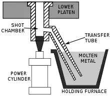 La fundición a presión en cámara caliente, también conocida como máquinas de cuello de cisne, se basa en una piscina de metal fundido para alimentar la matriz. Al principio del ciclo, el pistón de la máquina se retrae, lo que permite que el metal fundido llene el "cuello de cisne". A continuación, el pistón de accionamiento neumático o hidráulico fuerza la salida del metal del cuello de cisne hacia la matriz. Las ventajas de este sistema son la rapidez de los ciclos (aproximadamente 15 ciclos por minuto) y la comodidad de fundir el metal en la máquina de fundición. Las desventajas de este sistema son que está limitado a su uso con metales de bajo punto de fusión y que el aluminio no puede utilizarse porque recoge parte del hierro mientras está en el baño de fusión. Por lo tanto, las máquinas de cámara caliente se utilizan principalmente con aleaciones a base de zinc, estaño y plomo.[14]