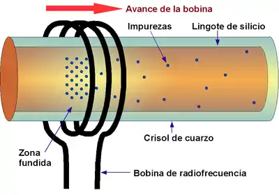 La fusión por zonas se realiza en un crisol de cuarzo que se mueve con respecto a una bobina de inducción, por la que circula corriente de radiofrecuencia que induce corrientes de Foucault en el semiconductor, llegando a fundirlo, por efecto Joule. Al ir avanzando la bobina, la zona fundida también lo hace, arrastrando consigo las impurezas, mientras el semiconductor se recristaliza al enfriarse. Se suelen realizar varias pasadas y, al final, se corta el extremo que contiene las impurezas acumuladas. Mediante este método se consigue una concentración de impurezas en el lingote tratado, que puede llegar a ser menor de una parte por millón.